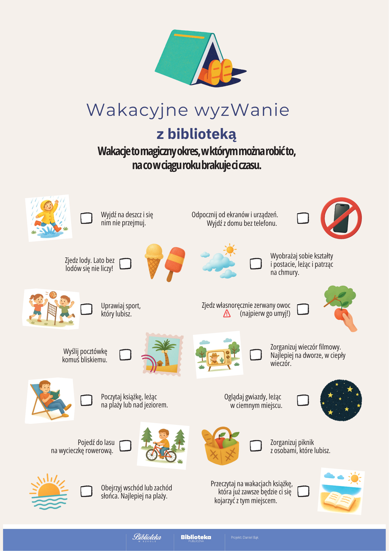 Jeśli chcesz podjąć wakacyjne wyzwanie, zajrzyj do biblioteki. Dostaniesz kartę, która będzie Ci przypominać o wakacyjnych atrakcjach - wyzwaniach. Być może takie wyzwanie podjął także Twój nauczyciel.