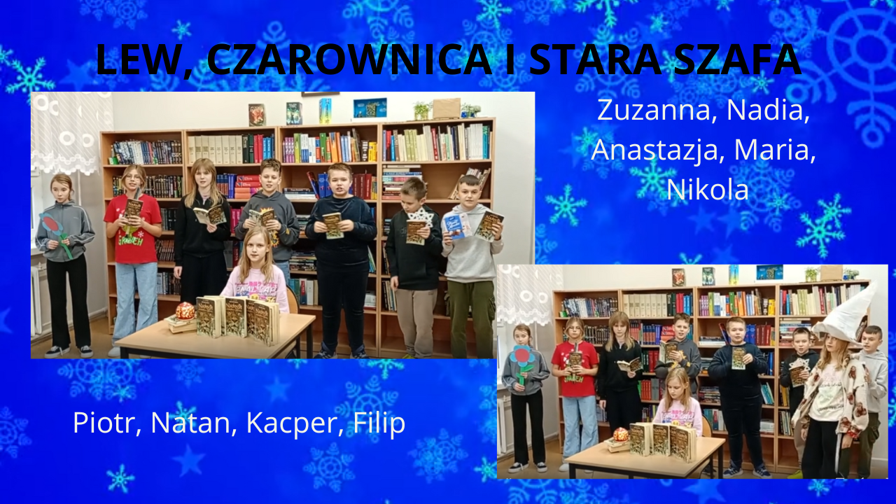W ramach obchodów Miesiąca Bibliotek Szkolnych ogłoszony został szkolny konkurs skierowany do uczniów klas IV–VIII. Zadaniem uczestników było przygotowanie prezentacji wybranej książki w dowolnej formie. Wyzwanie podjął zespół uczniów z klasy VI, który w ciekawy sposób zaprezentował powieść C.S. Lewisa. Uczniowie samodzielnie napisali tekst piosenki inspirowanej książką, a następnie zagrali, zaśpiewali i nagrali swój występ.