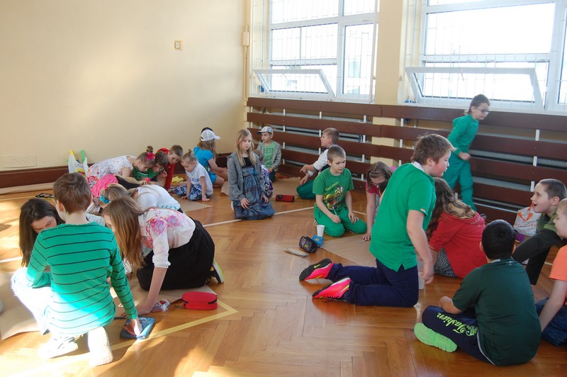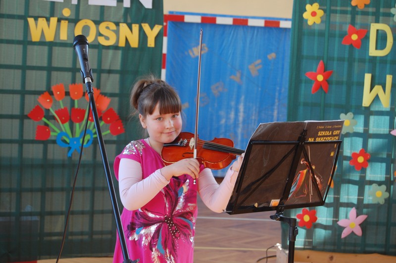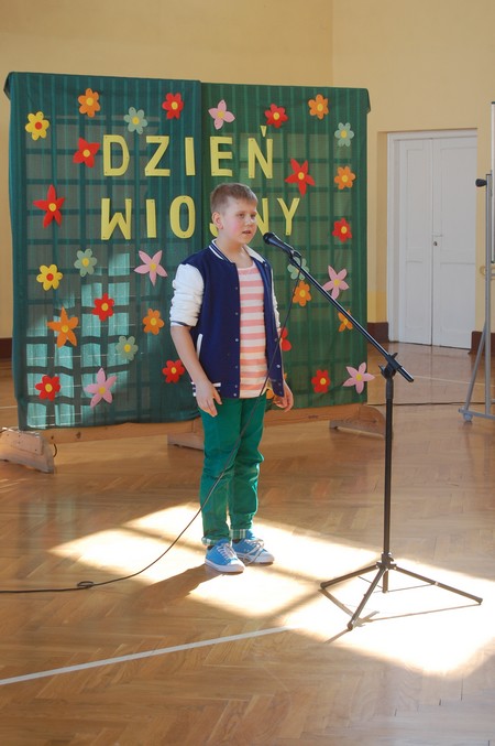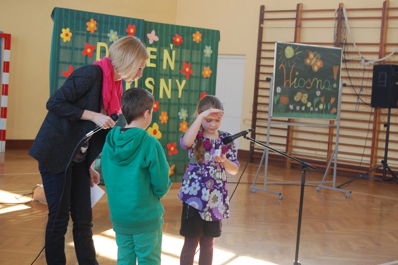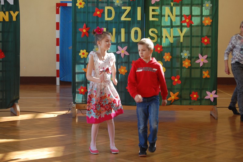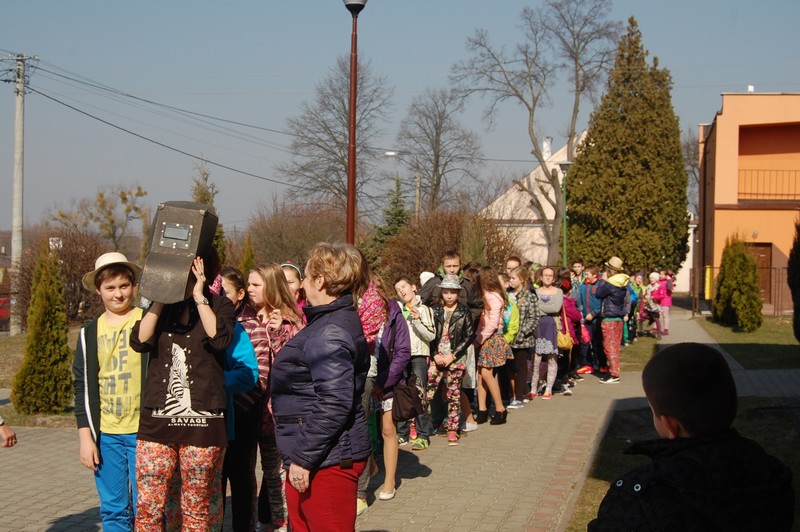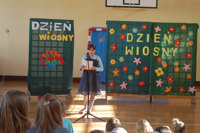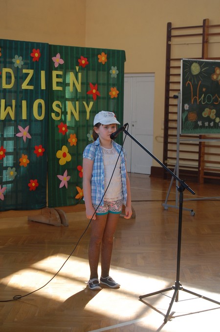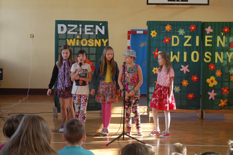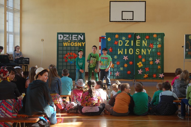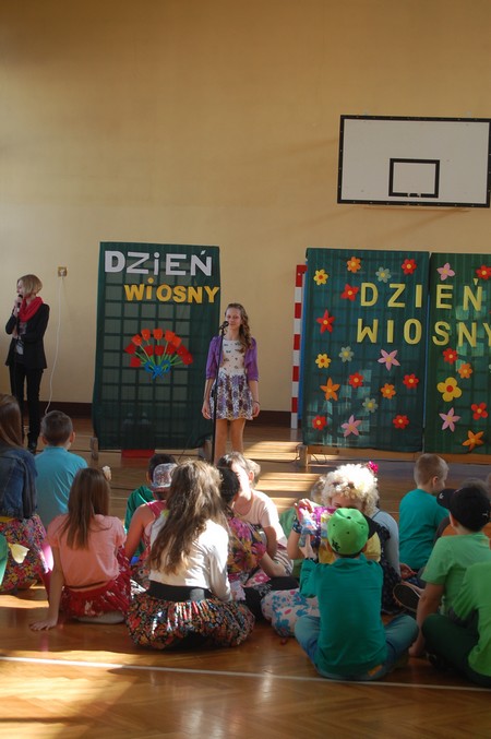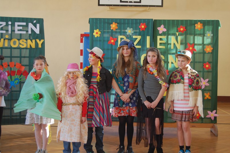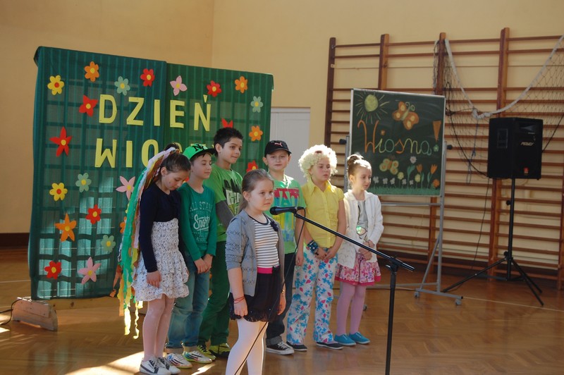 Samorząd Uczniowski przygotował uroczyste spotkanie dla uczniów klas 0-VI. Obowiązkowy strój tego dnia to barwy wiosny: zieleń, żółty i kwieciste wzory. Aby tradycji stało się zadość i zima na dobre nas opuściła każda klasa przygotowała żywą marzannę. Stroje były bardzo pomysłowe – po zaprezentowaniu się publiczności pożegnaliśmy marzanny. Następnym zadaniem było namalowanie przez każdą z klas portretu Pani Wiosny. Piękne plakaty udekorowały nasze szkolny korytarze i od razu zrobiło się weselej.