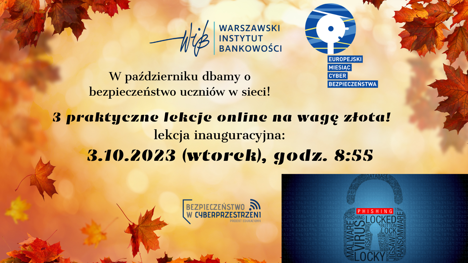 3 października 2023 r. z okazji Europejskiego Miesiąca Cyberbezpieczeństwa Warszawski Instytut Bankowości rozpoczął cykl webinarów składający się z 3 lekcji online, w których będzie poruszać różne zagadnienia ważne dla zachowania bezpieczeństwa uczniów w przestrzeni wirtualnej. Do tego wydarzenia włączyli się uczniowie kl. VI-VIII naszej szkoły pod opieką nauczycieli.