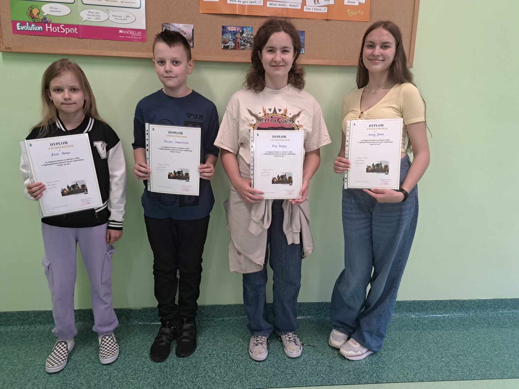 Uczniowie klas IV-VIII przystąpili do wiosennej edycji konkursu „Forget-me-not” pod patronatem czasopisma „Języki obce w szkole”. Miło nam zakomunikować, że aż 4 uczniów uzyskało bardzo wysokie wyniki i otrzymało wyróżnienie. Są to:
