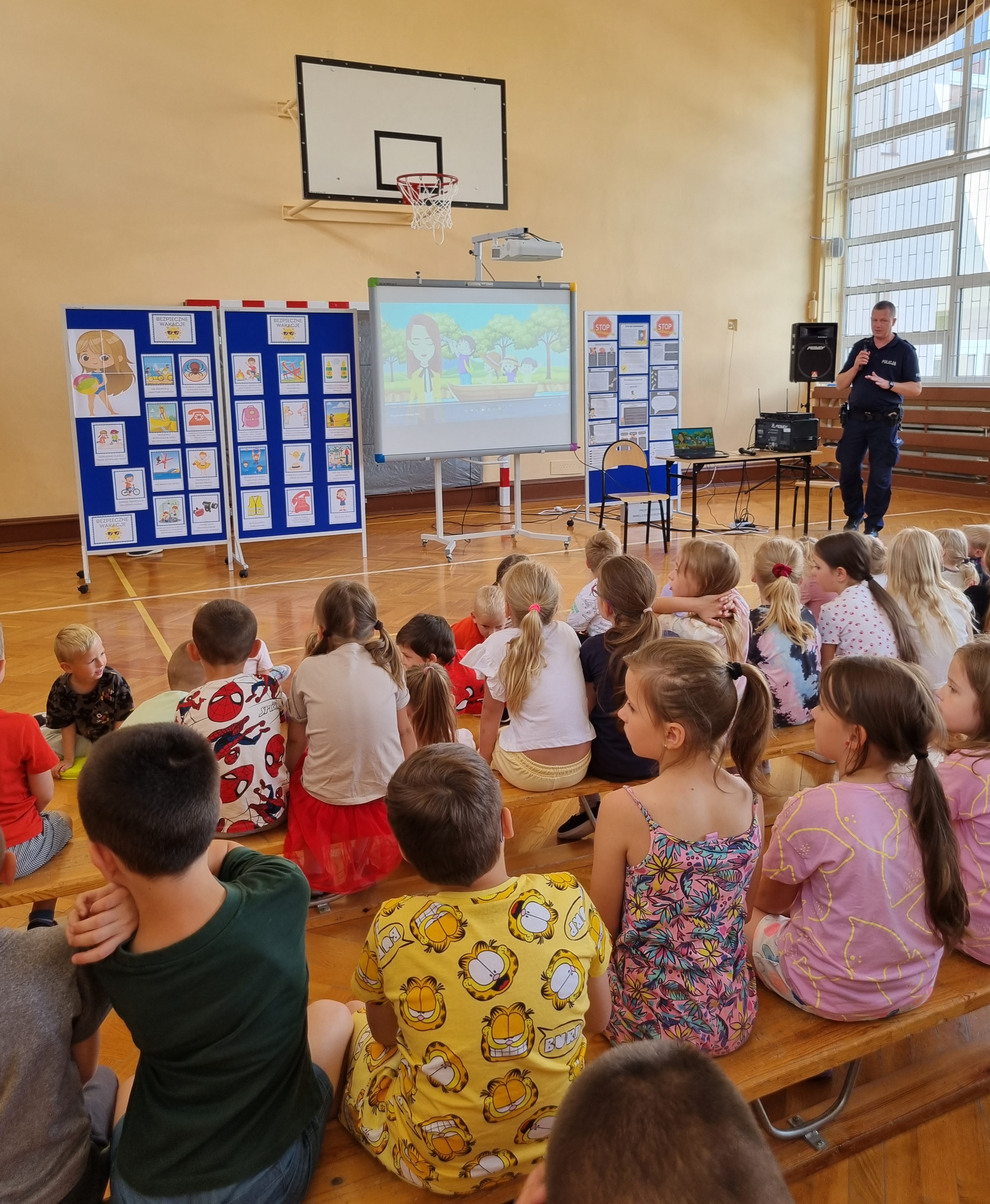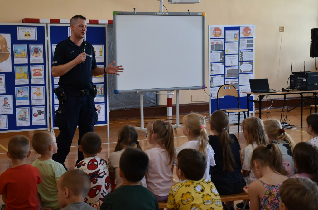 Z uczniami spotkał się przedstawiciel Komisariatu Policji w Pionkach mł. asp. Grzegorz Ociepa. Podczas prelekcji uczniowie zostali zapoznani z najistotniejszymi zagadnieniami odnoszącymi się do bezpieczeństwa podczas wakacji. Przestrzegano przed nieodpowiedzialnym korzystaniem z dróg jednocześnie zwracając uwagę na przestrzeganie przepisów ruchu drogowego. Wskazywano niebezpieczeństwa związane z nieodpowiedzialnym zachowaniem podczas zabaw na świeżym powietrzu. Poruszono tematykę wszelkich zachowań ryzykownych, oraz zagrożeń wynikających z używania substancji psychoaktywnych. Poruszono również tematykę bezpiecznego korzystania z internetu. Nie zabrakło przypomnienia zasad reagowania w sytuacjach zagrożenia w tym korzystania z numerów telefonów alarmowych. W ramach wystąpienia mł. asp. G. Ociepy uczniowie obejrzeli film profilaktyczny poruszający najistotniejsze zagadnienia odnoszące się do bezpiecznego wypoczynku w czasie wakacji.