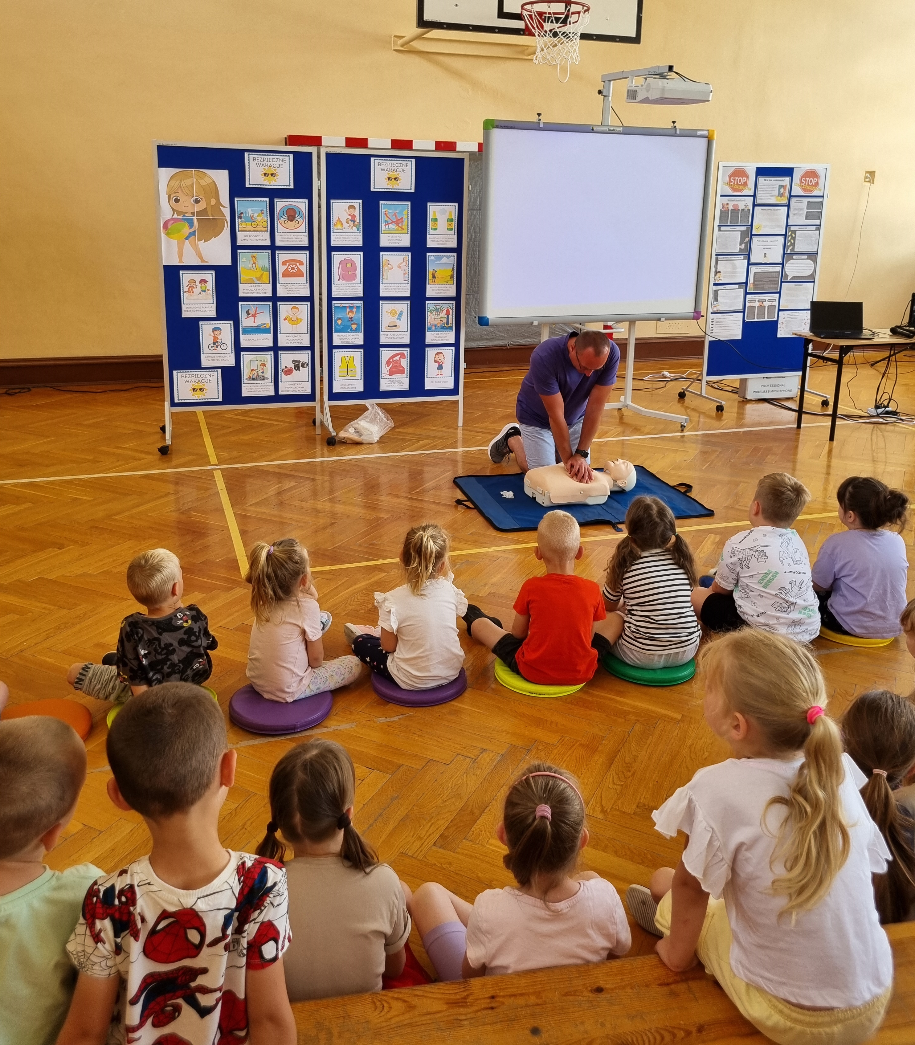 Dzięki zajęciom przeprowadzonym przez pana Karola Śmietankę wszyscy uczniowie mieli możliwość poznać podstawowe zasady odnoszące się do bezpiecznego korzystania z kąpielisk. Omówiono wszelkie zagrożenia wynikające z niewłaściwego korzystania z wypoczynku nad wodą. Poruszono tematykę udzielania pomocy osobie tonącej. Szczegółowo omówiono zasady pierwszej pomocy przedmedycznej ze szczególnym zwróceniem uwagi na resuscytacje krążeniowo oddechową. Omówiono zasady postępowania w przypadku omdlenia czy zasłabnięcia. Przekazano wiedzę z zakresu udzielania pomocy osobie która uległa zadławieniu.