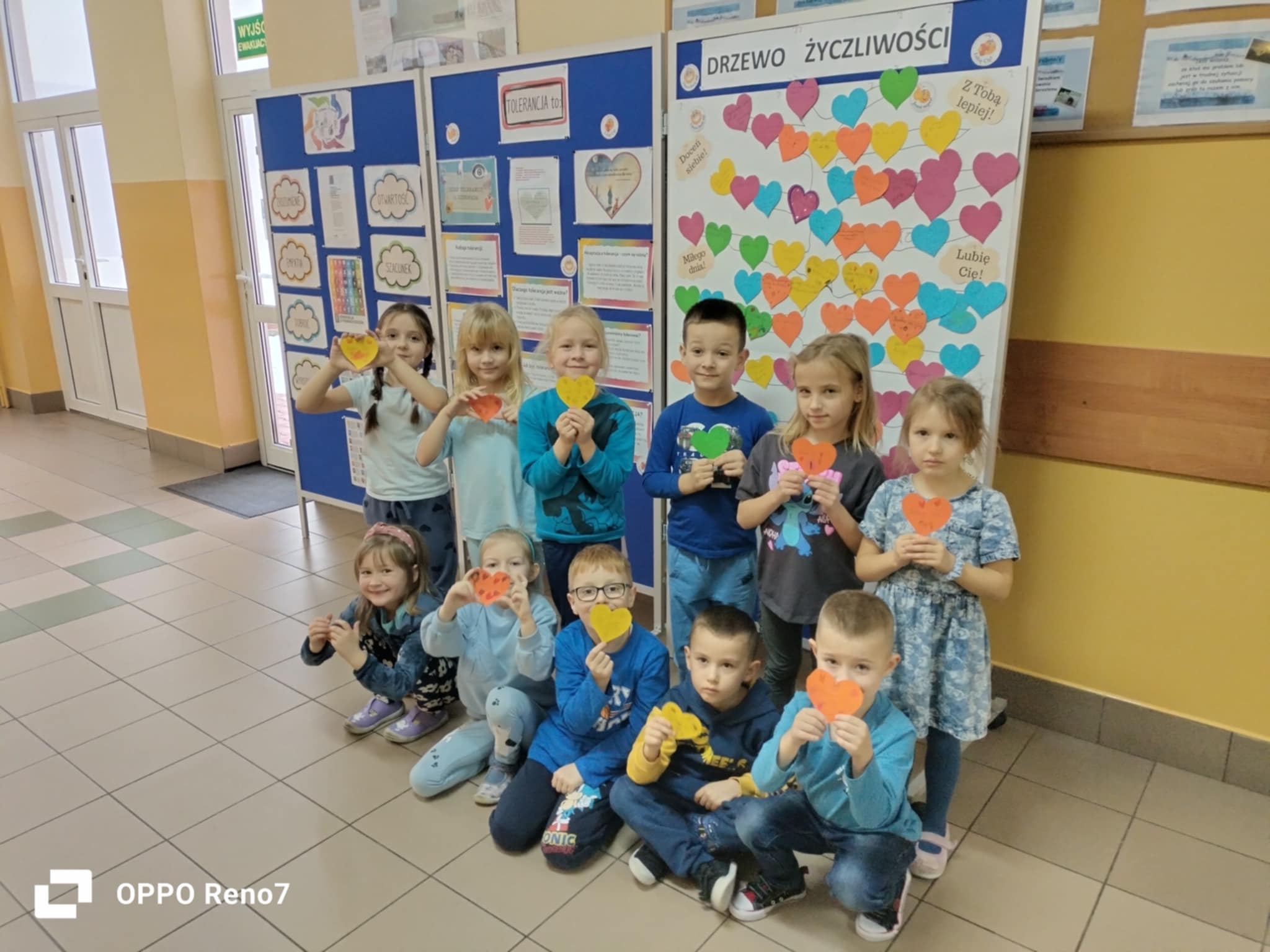 Na korytarzu szkolnym znajdują się również gazetki dotyczące tolerancji, życzliwości i praw dziecka.