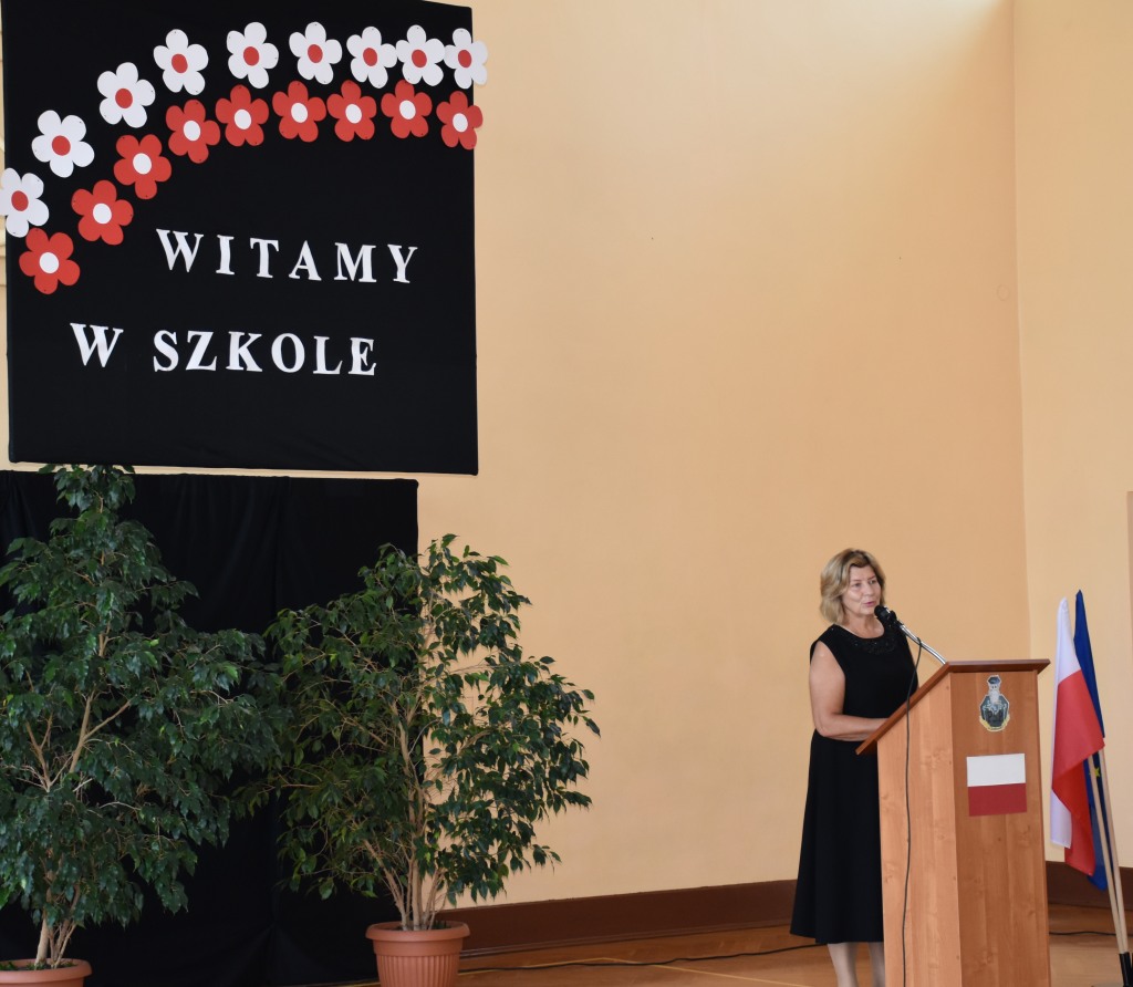 Pani dyrektor Ewa Pałucka powitała szanownych gości, uczniów, rodziców, nauczycieli i życzyła, by praca i nauka była źródłem satysfakcji i radości.